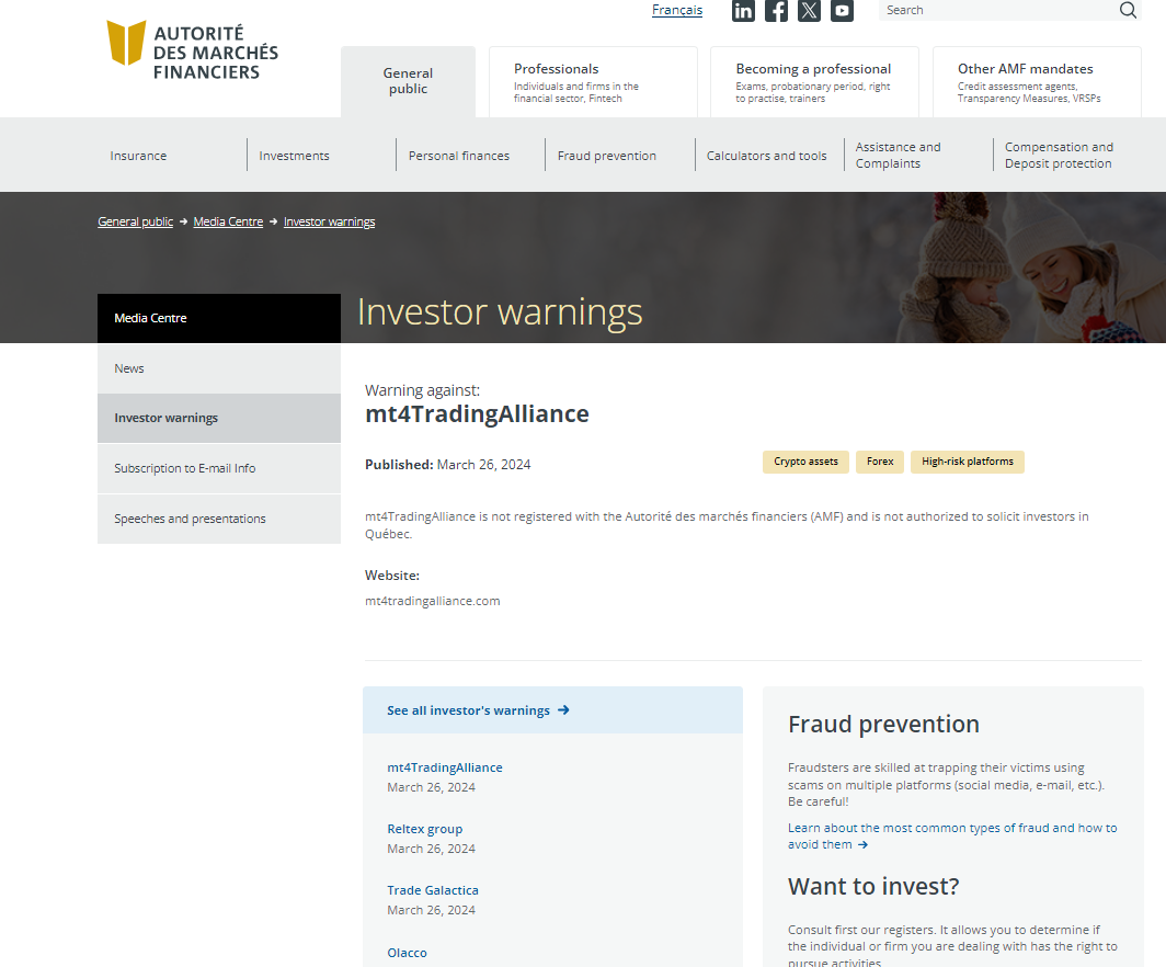 Autorité des marchés financiers of Quebec has issued a warning against mt4tradingalliance.com. The subject of the warning is: